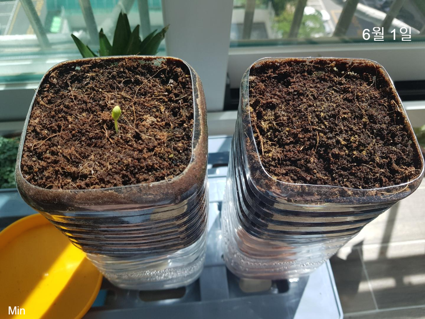 6월 1일에 뒤늦게 한 화분에서 새싹이 나왔다~